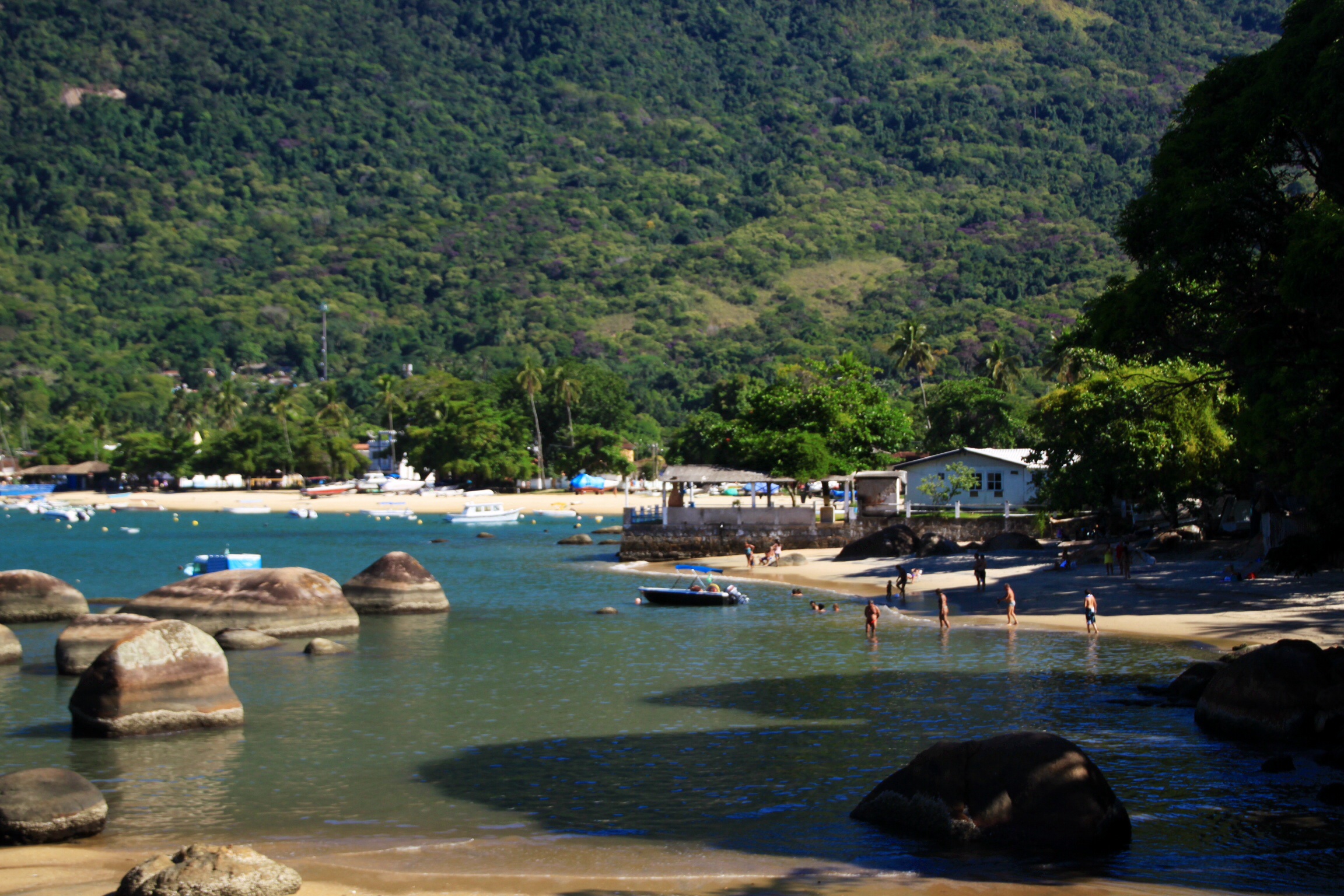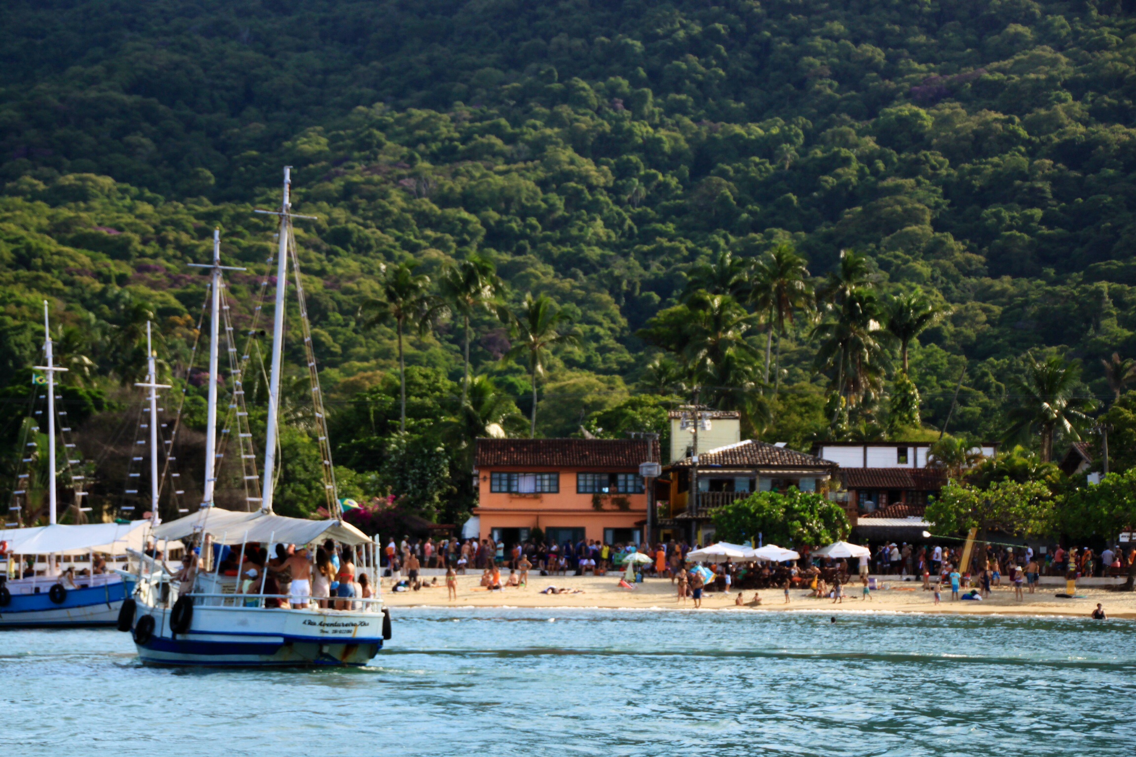On Friday, we reluctantly checked out of the Miramar, took some final pictures and were picked up for our transfer to the island at 10.30. Two hours later, having circled Copacabana within a 2 mile radius of our hotel several times over, we finally left town. Our bus was mainly made up of Europeans and we spent a fair bit of the two hour journey to the port chatting to two girls, Milly and Holly, from Clapham who had arrived on holiday the night before and who were getting some rest before Carnaval. Just as well as on the island we pretty much saw them every night! In sweltering heat we were then taken (after our relaxed-to-the-point-of-horizontal escort had picked up his lunch with everyone waiting and sweating with their backpacks in the baking sun) to our boat, the Aquaholic. An hour’s crossing and we we finally arrived on the island of Ilha Grande, surprised to see a bustling beachfront with a queue stretching down its length (not what we’d imagined for our idyllic island stay) but breathed a sigh of relief as we found out it was temporary traffic from a cruise ship anchored nearby for the day. As we learnt, things were a lot quieter after the weekend…