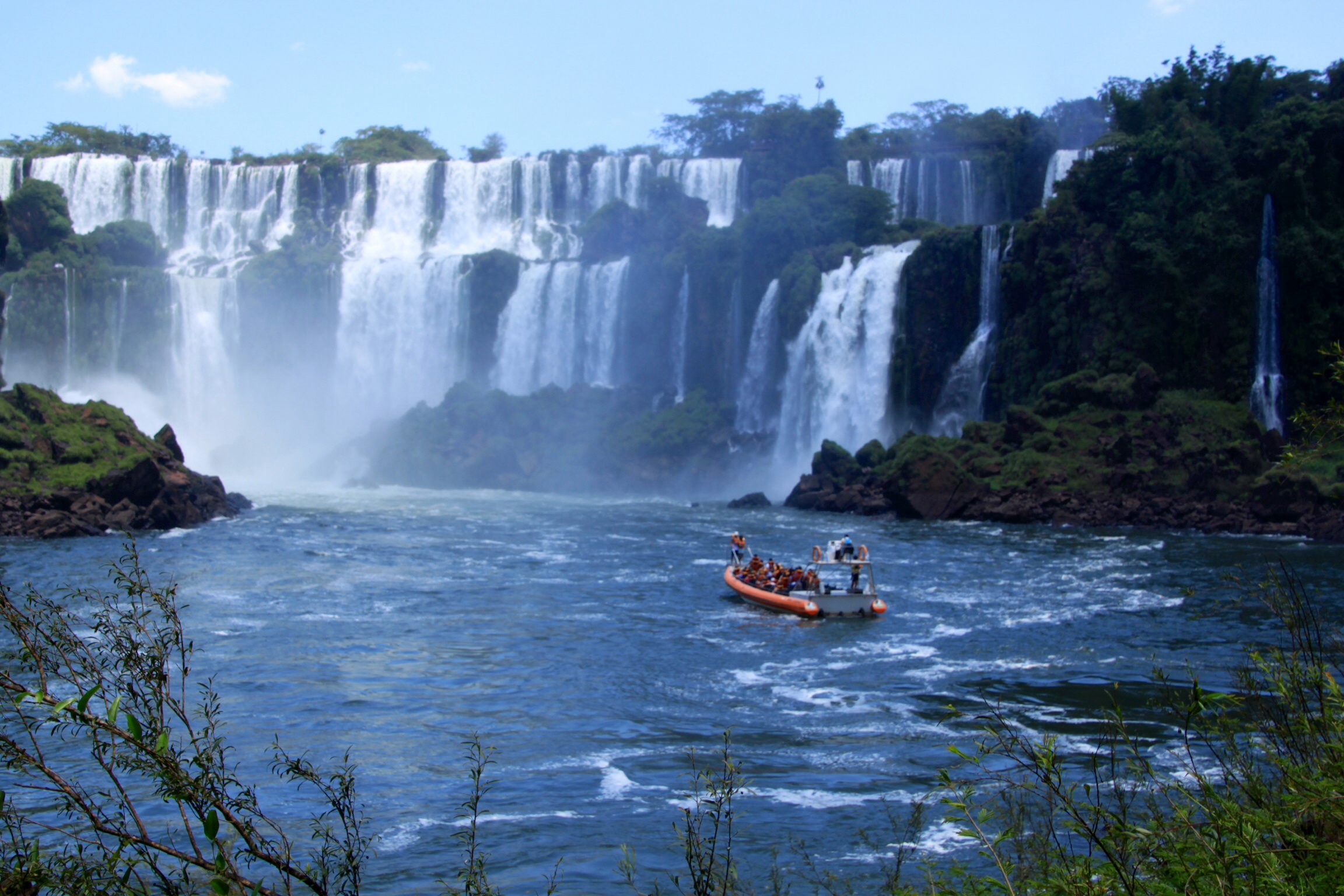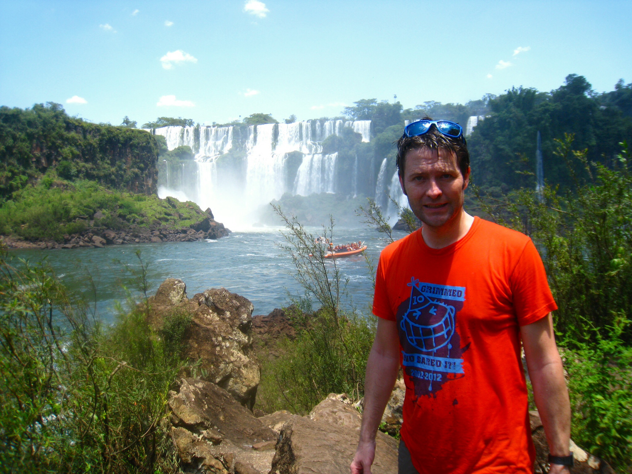 Not cool enough, we jumped onto a boat trip that took us up even closer to the bottom of the falls. Wondering how wet we would get, our question was soon answered as we were given a waterproof ruck sack for all our belongings and the skipper and photographer appeared in head to toe waterproofs. As soon as we were all on board, the speed boat set off at full throttle straight into and under one of the smaller falls and we all got drenched. We then shot round to a larger fall and the captain headed the boat directly into the middle of the falling water, disappearing from view of the spectators on land. We emerged soaked through but in the heat we were almost dry within the hour as we took the Jungle Train and squelched our way across platforms to the Garganta del Diablo for our final spectacular photocall. We then headed back to our hotel in Puerto Iguazú for more sun and late afternoon radio ga ga.