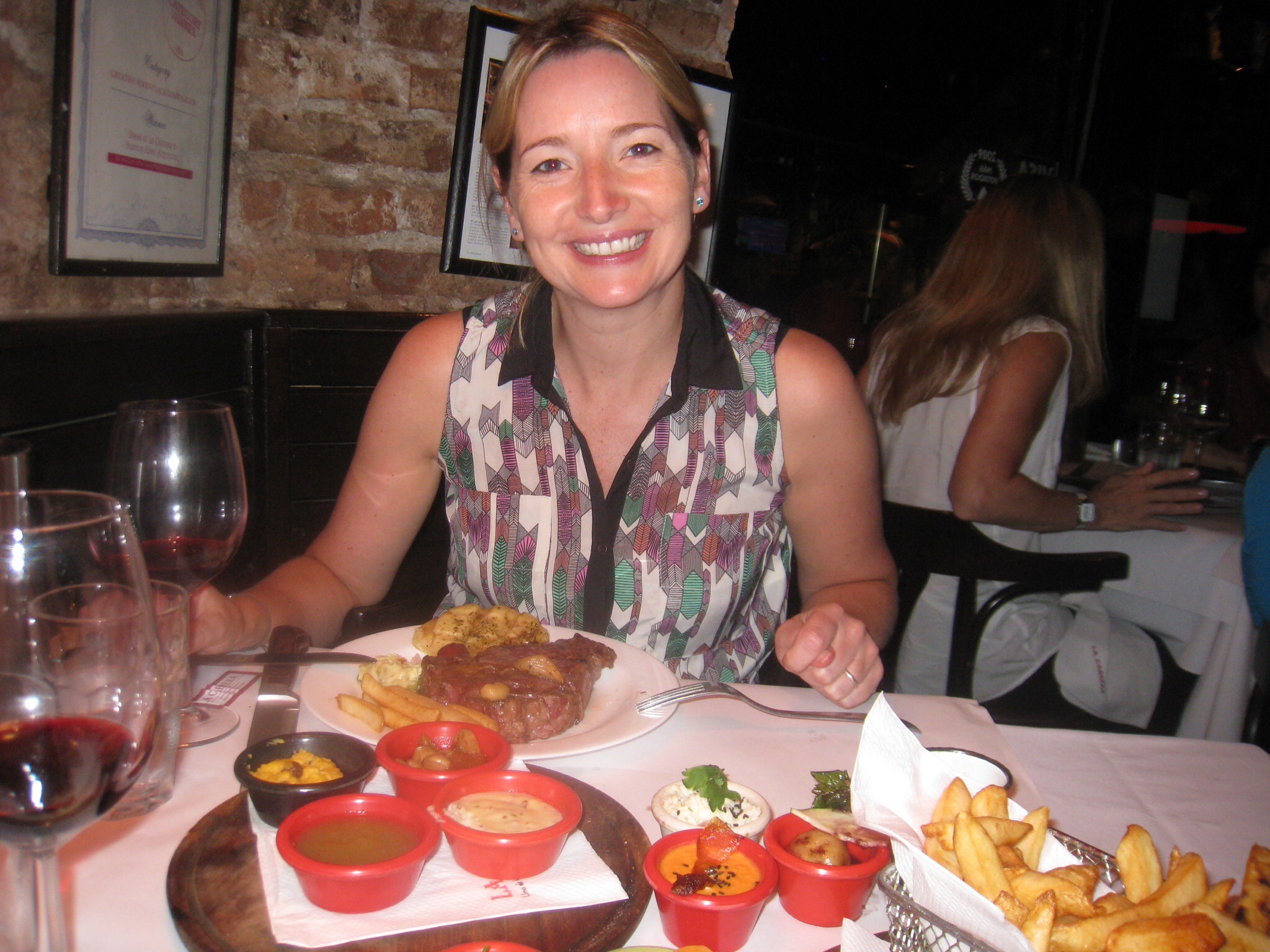 To reward ourselves for our cultural efforts, we decided to walk past the Floralis Generica (a newer steel sculpture symbolising Hope) and into Recoleta to treat ourselves to some afternoon wine at THE bar to be seen (read: expensive hence the lack of lunch to go with it). We spent a very pleasant hour there before realising we had some walking to do to get back to the subway and that we were running out of time before dinner. Having dashed across town, we arrived back at our room to find a bottle of fizz awaiting us (courtesy of Daddy Holder!) plus a half bottle of red wine from the hotel to apologise for that morning’s laundry ‘misunderstanding’ (it was worth almost having no clean pants for Rio!) We drank the fizz whilst chatting and getting ready for our evening out – dinner at La Cabrera, our wedding present from Nay and Jimmy Dare!