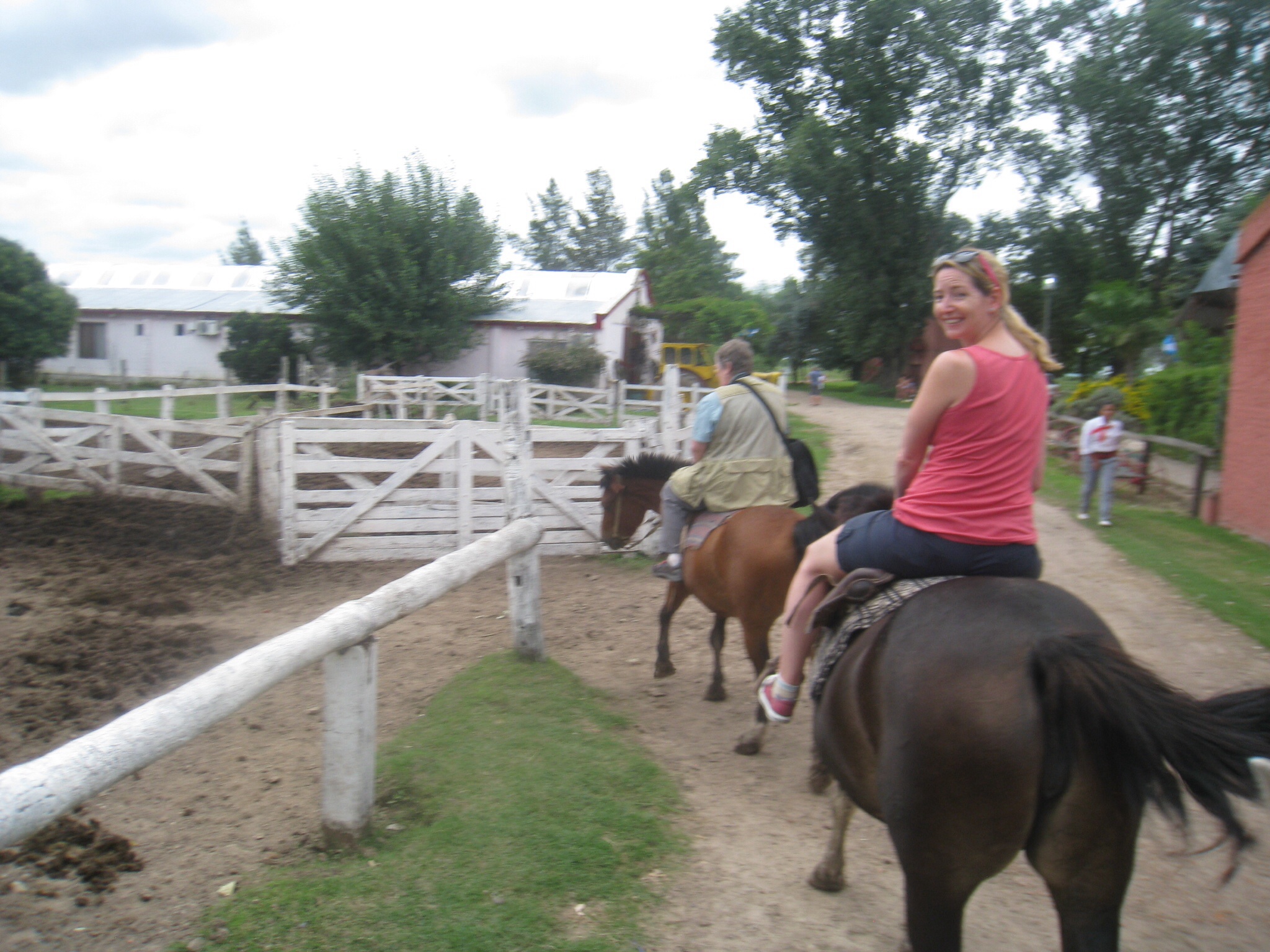 Having picked up the last of the group, we headed out of town and into the Pampas region. After about an hour we arrived at our destination and were greeted with an empanada (delicious) and a glass of wine (pre midday again but we weren’t complaining). We then had free time to look round the grounds – our favourite sight was some stunted cows! – and to do some activities. We opted for the horse riding. Hoisted safely onto our slightly tired looking steeds, we set off on a 10 minute round route of the ranch…only Charlie’s horse finally decided it was all a bit much and just before the end put its front legs down followed by its back and proceeded to try and roll over! Needed to say, there was a fairly rapid, if slightly inelegant, dismount.